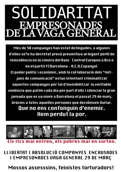 Una cincuentena seis de detenidos a día uno, tres en prisión, varios en libertad bajo fianza y otros en libertad provisional o vigilada. Tres heridos graves, otros tres tuertos por las balas de goma, una veintena de apaleados con politraumatismos…. Las cosas para vosotros son más importantes que las personas… Imagino a vuestro infame Felip Puig y vuestro neofranquista Jorge Fernández Díaz brindando cava catalán cuando consigan emular a Fraga con varios muertos en manifestaciones… Mandan golpear a niños de secundaria, a familias con pequeños, a asaltar las viviendas de los que por sus políticas no pueden pagarlas, a disparar a nuestro pueblo con lo que haga falta… Pero estáis atemorizados, la gente ya no huye despavorida como hace pocos años ante la presencia de vuestros robocops. Estos el 29M estrenaron los gases,, pronto los tanques de agua, quien sabe incluso utilizaran el fuego real, las granadas aturdidoras o los cañones de microondas… Es una utopía del Estado-Capital el vencernos, como una hiedra de cien cabezas, como el ave fénix la rebeldía a su brutalidad siempre estará presente.